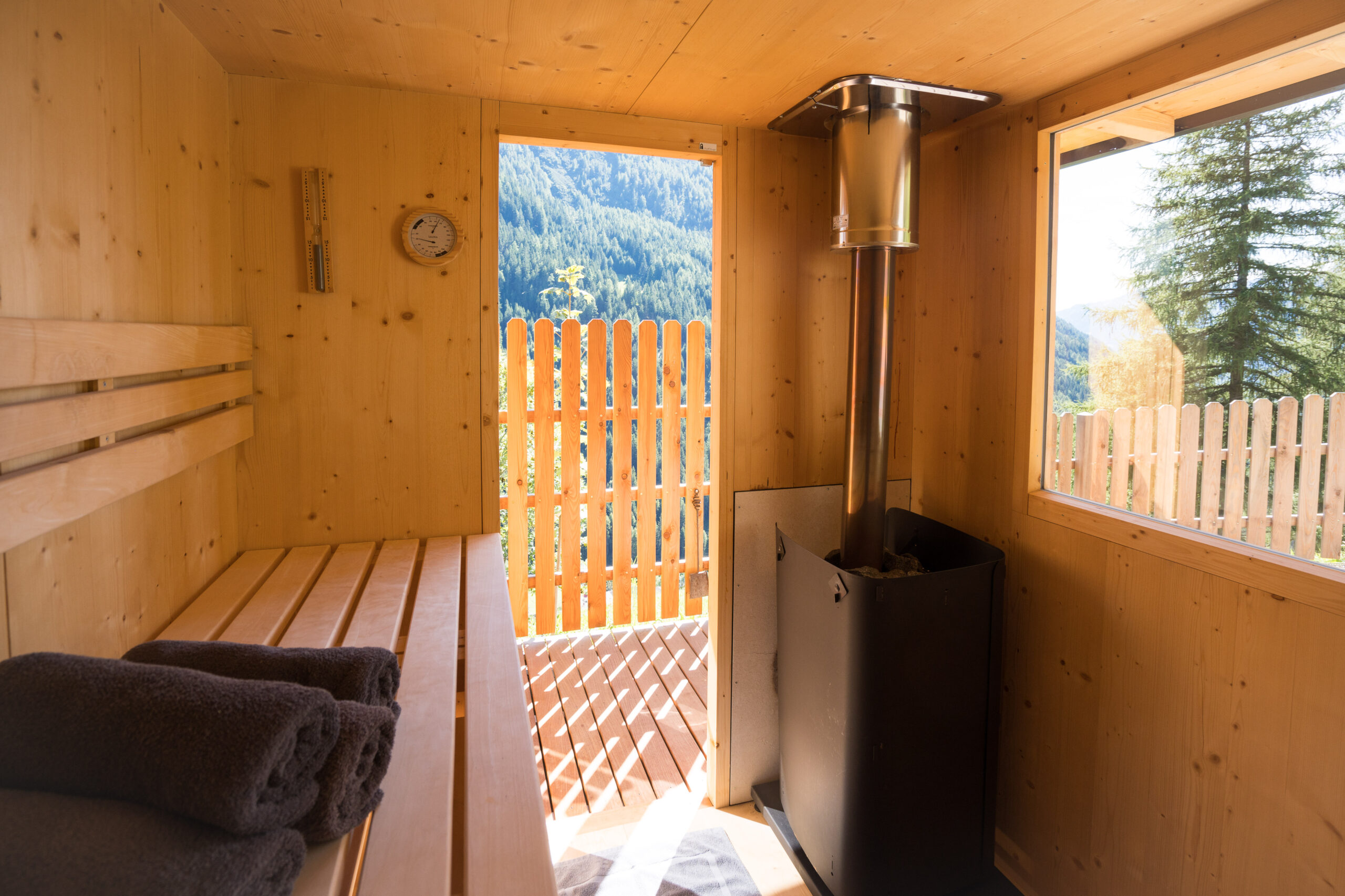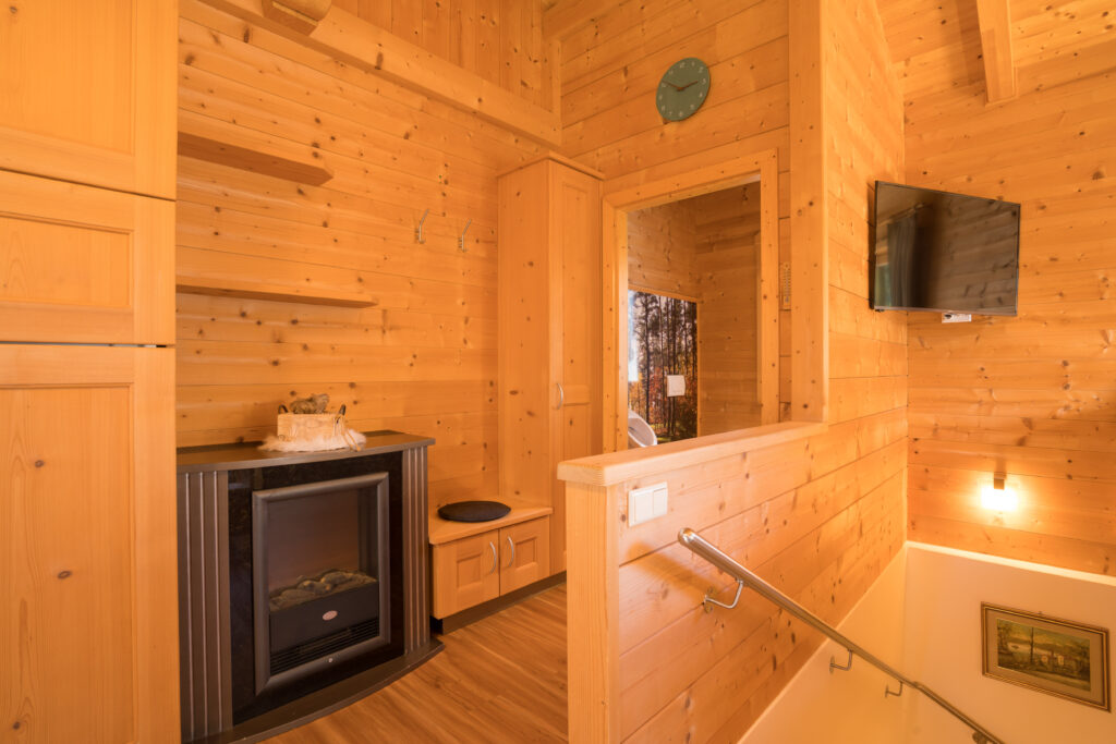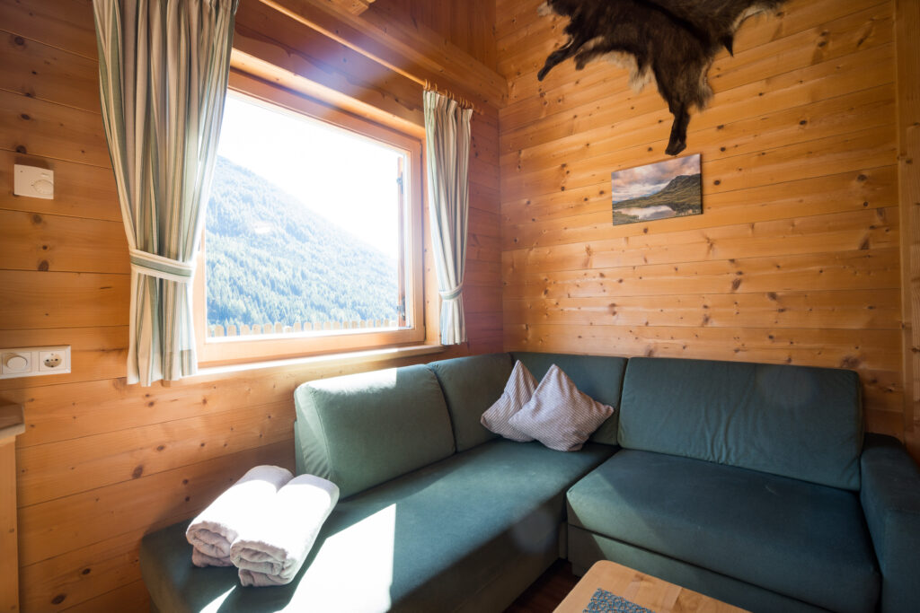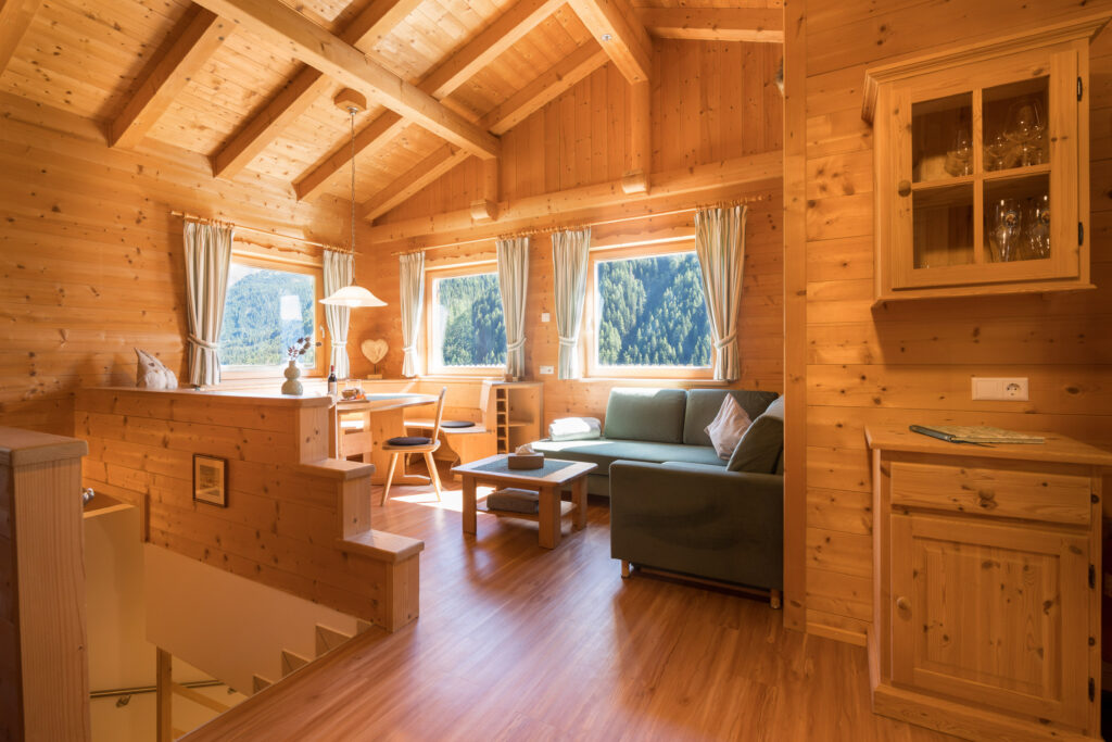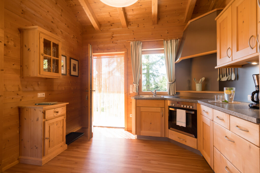 Das gesamte Innere des Chalets ist aus Holz gefertigt, strahlt Gemütlichkeit aus und bietet einen lichtdurchfluteten Wohlfühlraum mit einer voll ausgestatteten Küche, einer gemütlichen Sitzecke und einem entspannenden Bereich mit Couch und Sat-TV. Im Untergeschoss befinden sich zwei hübsche Doppelzimmer mit jeweils einem Doppelbett (160 x 190 cm) sowie ein Badezimmer mit Dusche, Waschtisch, WC und Bidet. Ein Zusatzbett für Kinder bis 14 Jahre ist verfügbar.